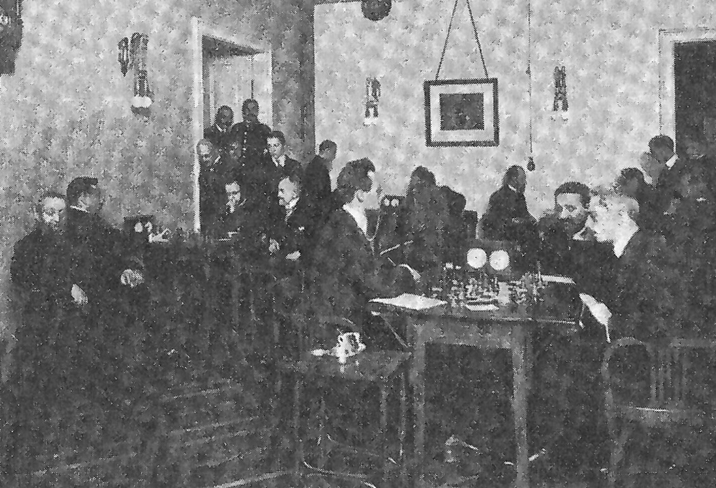 S to partijo se poslavljamo od ustvarjalnosti najbolj žlahtnega kavarniškega velemojstra druge polovice XIX. stoletja. Szymon Winawer je živel v Varšavi še do leta 1919. Na spodnji sliki najdete ostarelega »čarovnika iz Varšave« skrajno levo – zasluženi dremež med šahisti …