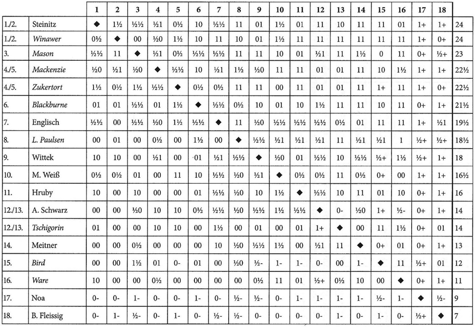 V partiji Mackenzie-Winawer se je približevala časovna kontrola, kakršnakoli je takrat pač bila, in Winawer je odigral namesto 29…Dh4 z nejasnimi posledicami nesrečno potezo 29…Dc5, nakar se je moral po 30.Tg8! – predati. A že v naslednjih dveh krogih je dosegel dve pomembni zmagi proti Blackburnu in Zukertortu.